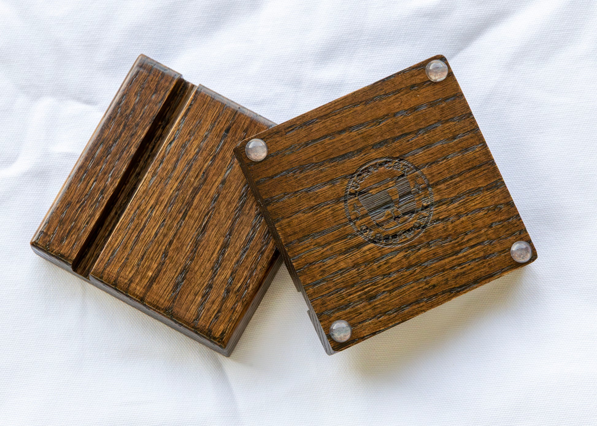 FINISHED DIMENSIONS: 4"x9" glass panel, with a 4"x4"x.75" wooden base. This stained red oak wooden base is handmade to allow the piece to be freestanding. The base includes rubber feet to ensure stability and a non-slip footing for your glass art.