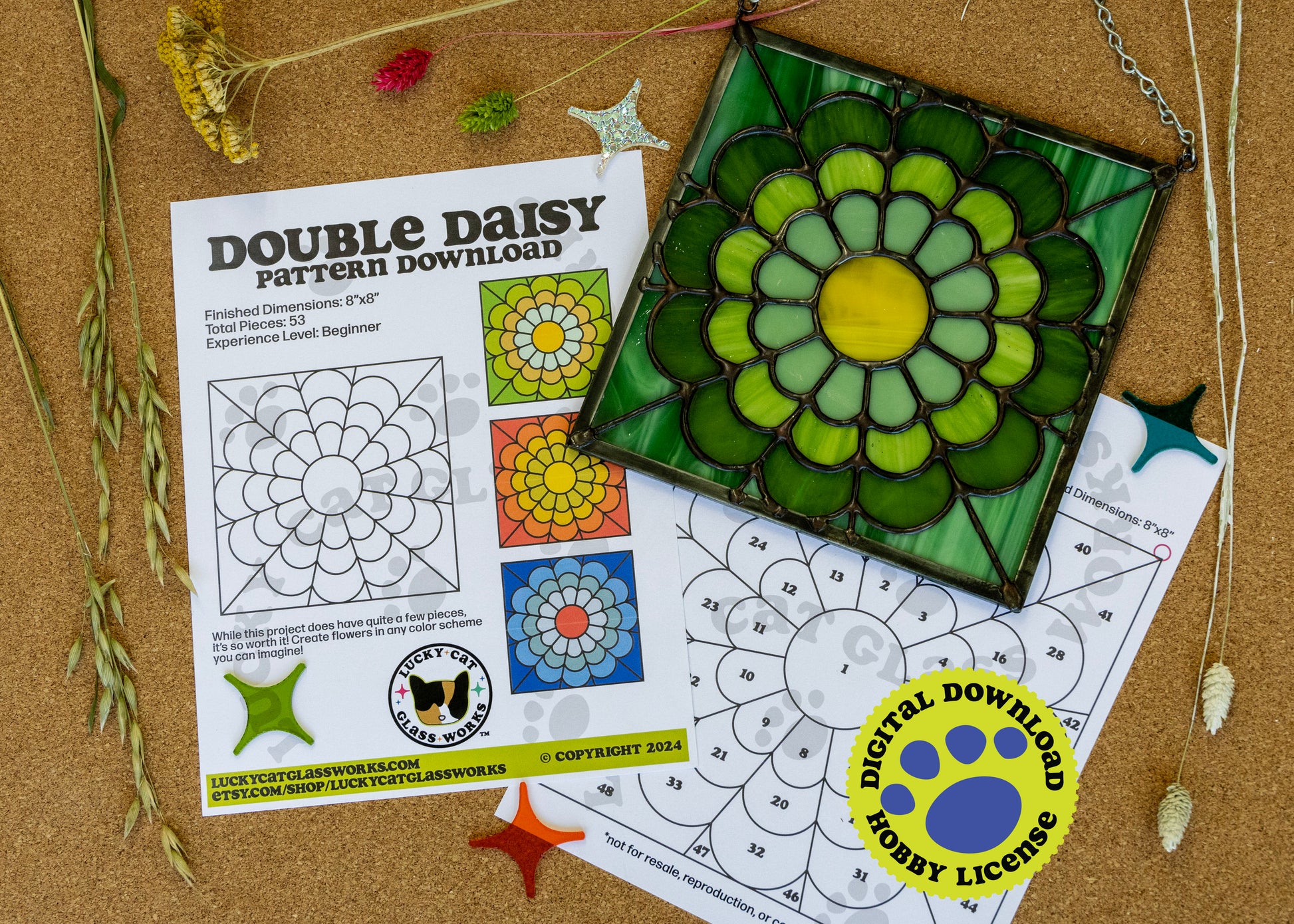 This is a digital download of the DOUBLE DAISY stained glass pattern created by Lucky Cat Glass Works.This project is designed for the copper foil stained glass method.