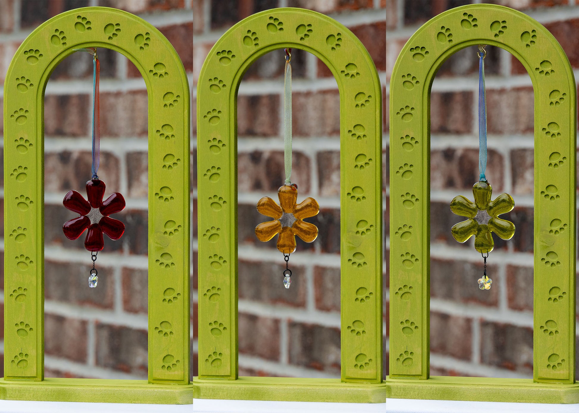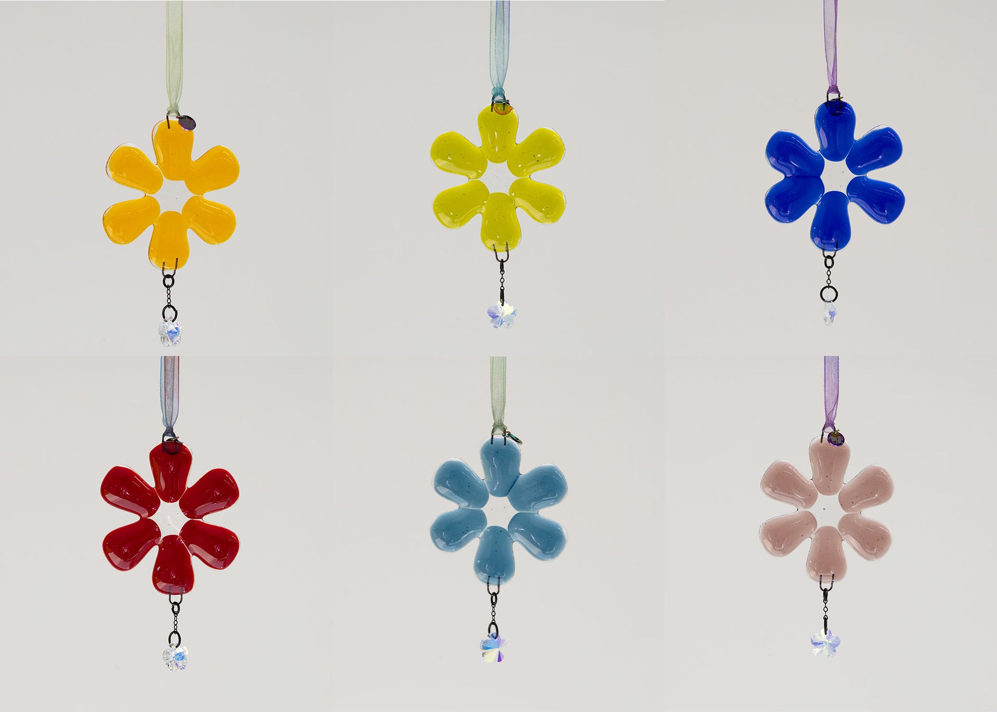 These glass flowers made from transparent glass are oh so lovely in the sun! Each fused flower dangle is carefully cut and assembled in a glass kiln before being fired to perfection.