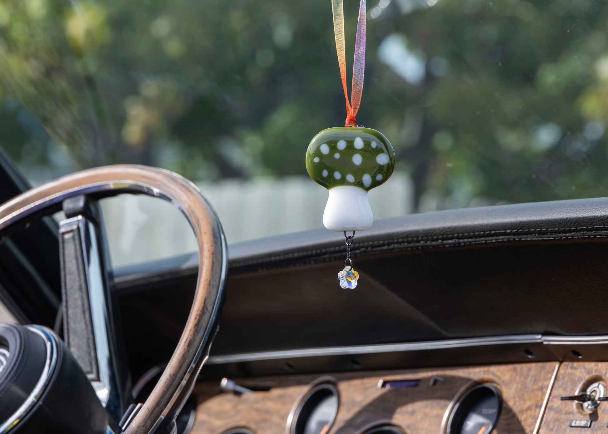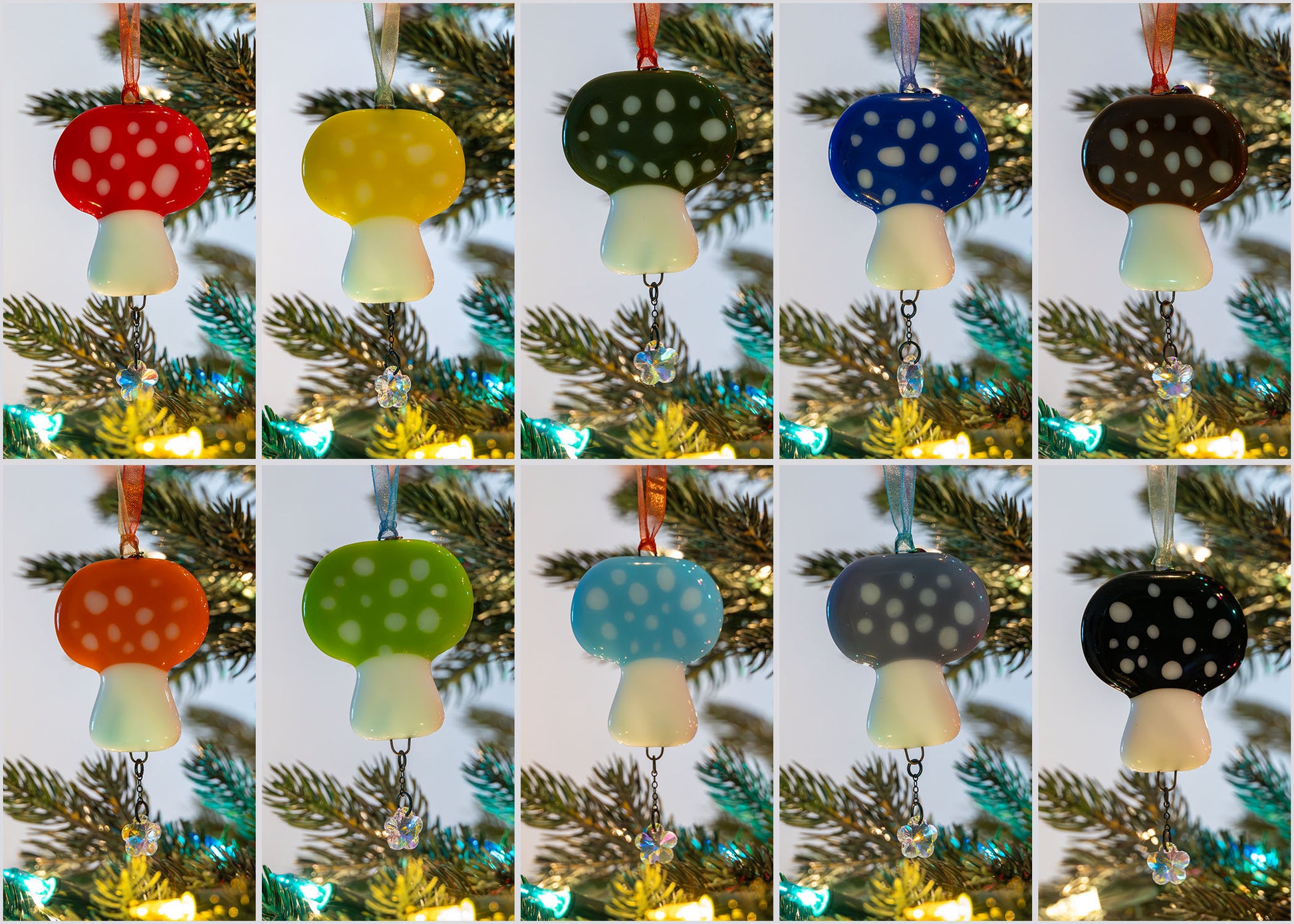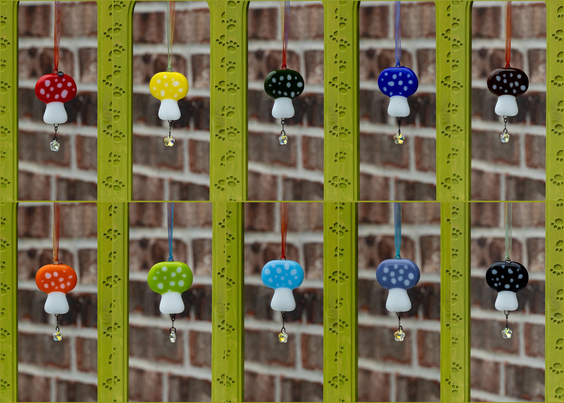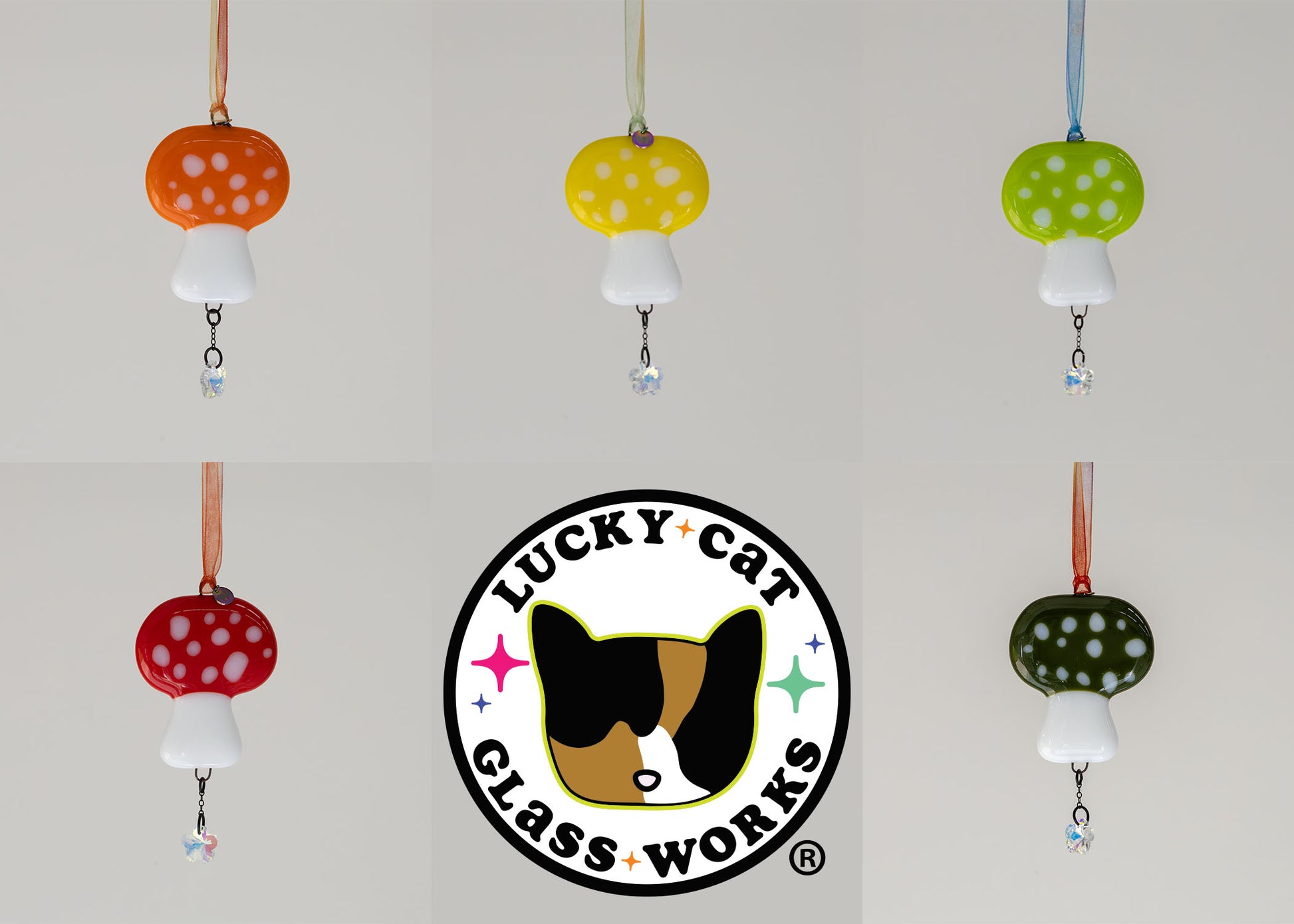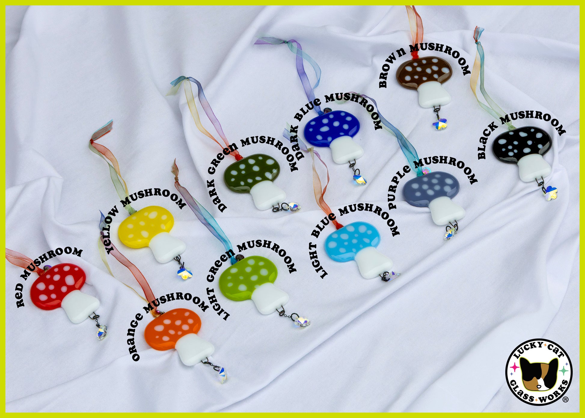 A mushroom for every color of the rainbow! These delightful dangles are made from opaque glass with white dots across each cap. Each fused mushroom dangle is carefully cut and assembled in a glass kiln before being fired to perfection.