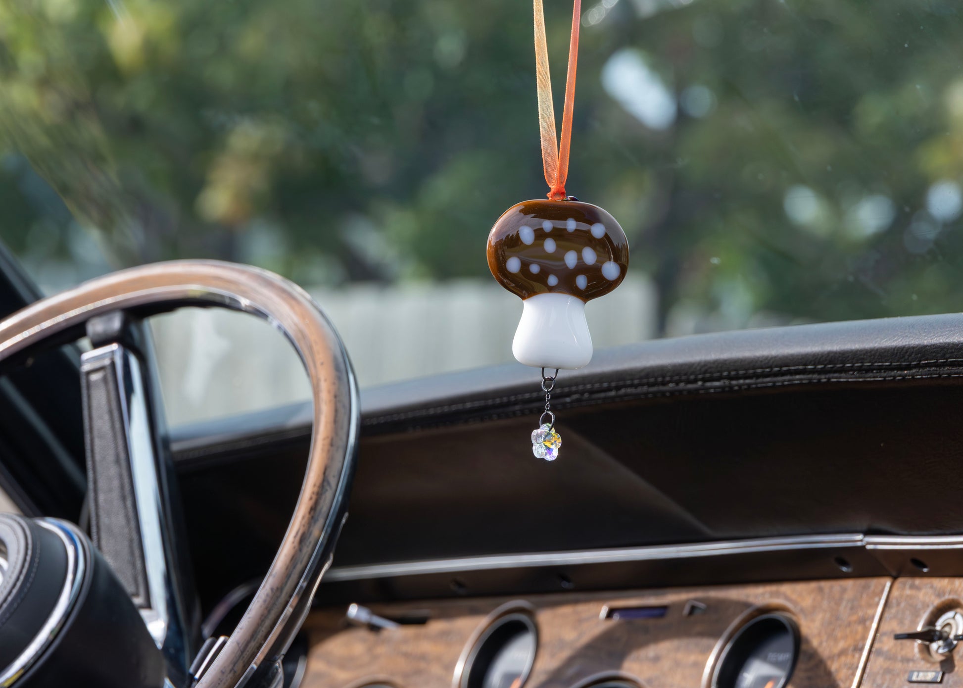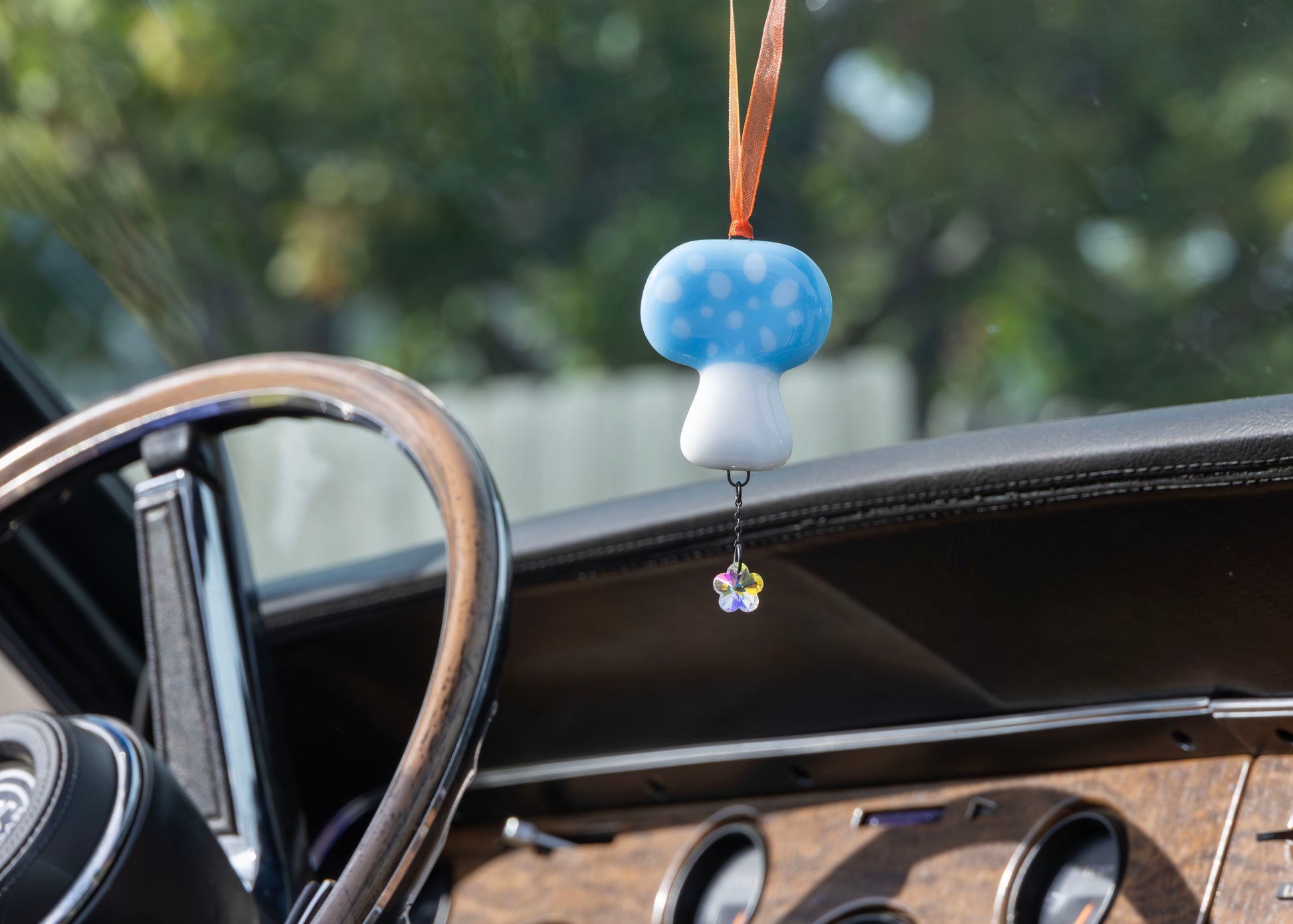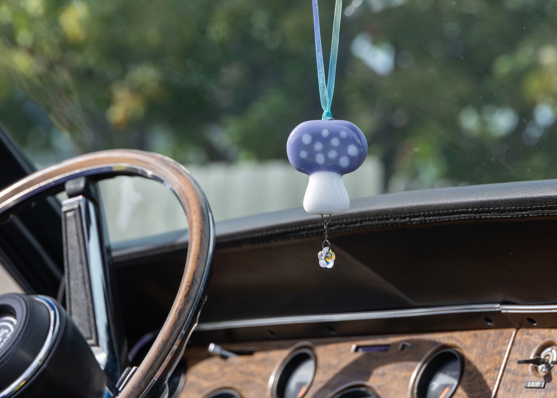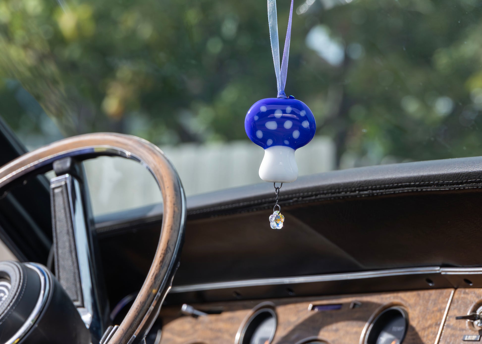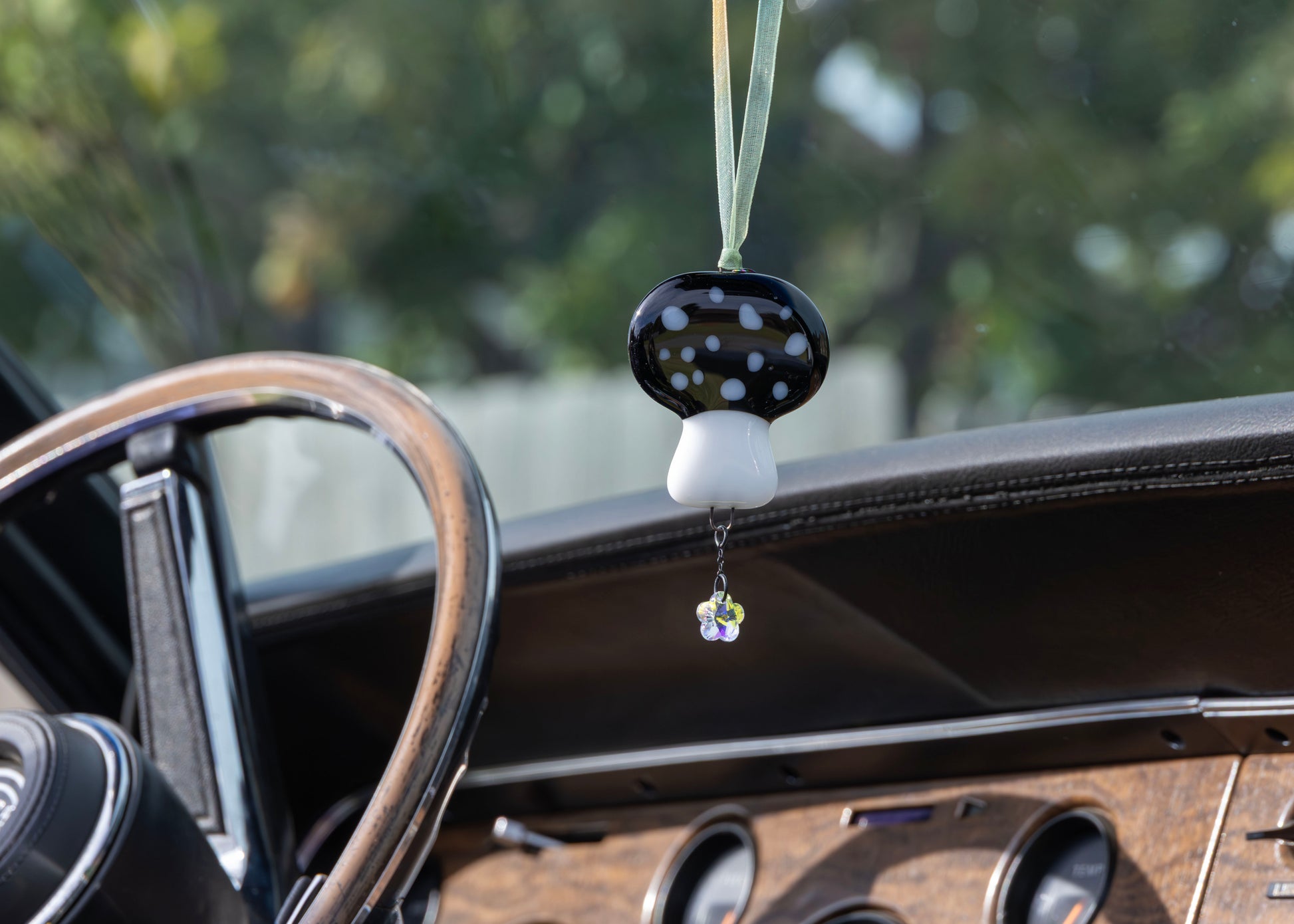 A mushroom for every color of the rainbow! These delightful dangles are made from opaque glass with white dots across each cap. Each fused mushroom dangle is carefully cut and assembled in a glass kiln before being fired to perfection.
