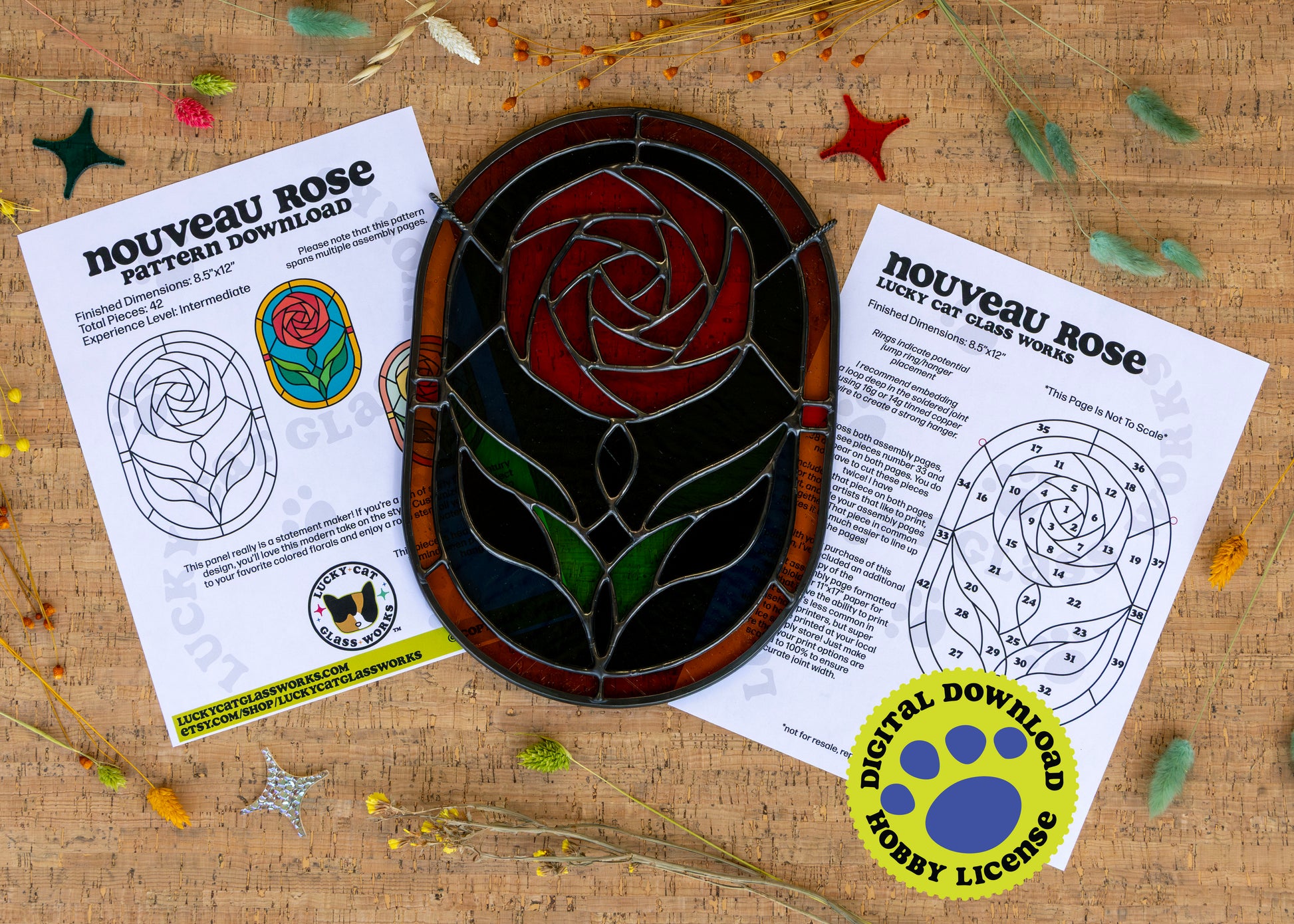 This is a digital download of the NOUVEAU ROSE stained glass pattern created by Lucky Cat Glass Works. This project is designed for the copper foil stained glass method.