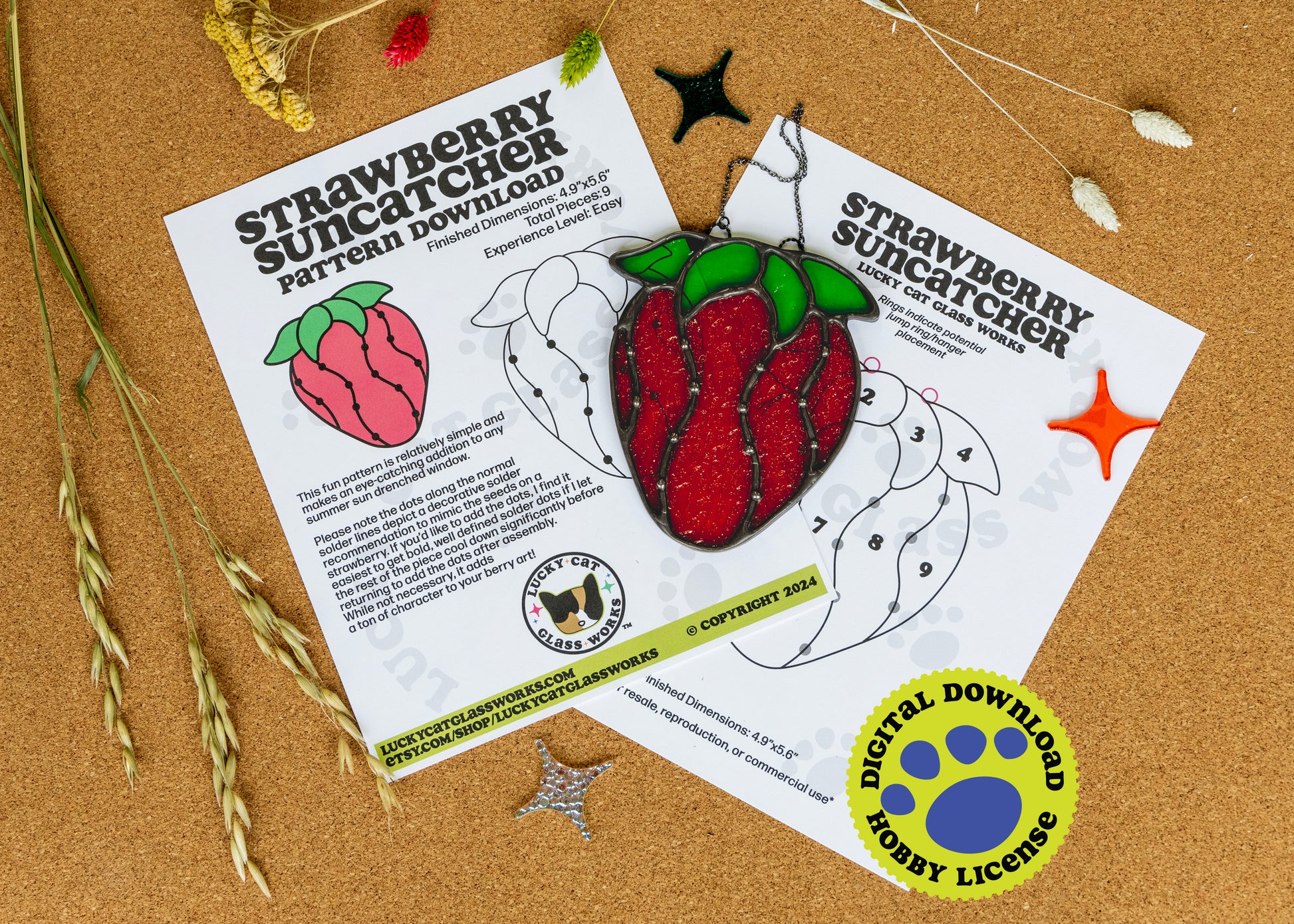 This is a digital download of the STRAWBERRY SUNCATCHER stained glass pattern created by Lucky Cat Glass Works.This project is designed for the copper foil stained glass method.